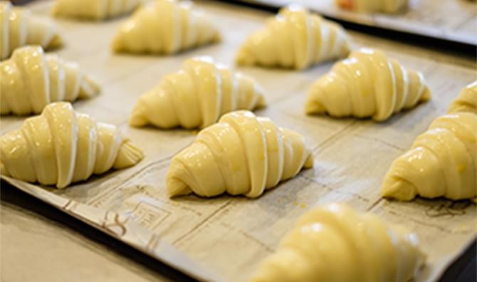生地冷蔵と生地冷凍は、小麦本来のフレッシュな味わいを感じられる生地です。焼く当日に、分割、発酵、成形をして焼くため、イレギュラーな形のパンを作りたい時などでも、生地のロスを抑えられ、アレンジが自在に。供給量を細かく調整できるため、需要に合わせた生地の仕込みが可能となり、生地全体でもロスを減らすことができます。